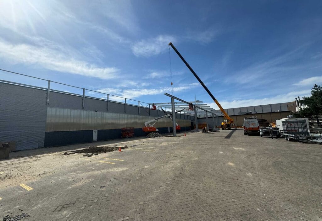 Onlangs hebben we niet alleen de Posthoornstraat uitgebreid, maar zijn we ook gestart met een nieuwe fase van groei binnen M.J. van Riel! Op ons terrein zijn we nu bezig met de bouw van een overkapping, die zal dienen voor de stalling van ons transport en voor eventuele opslagmogelijkheden.
