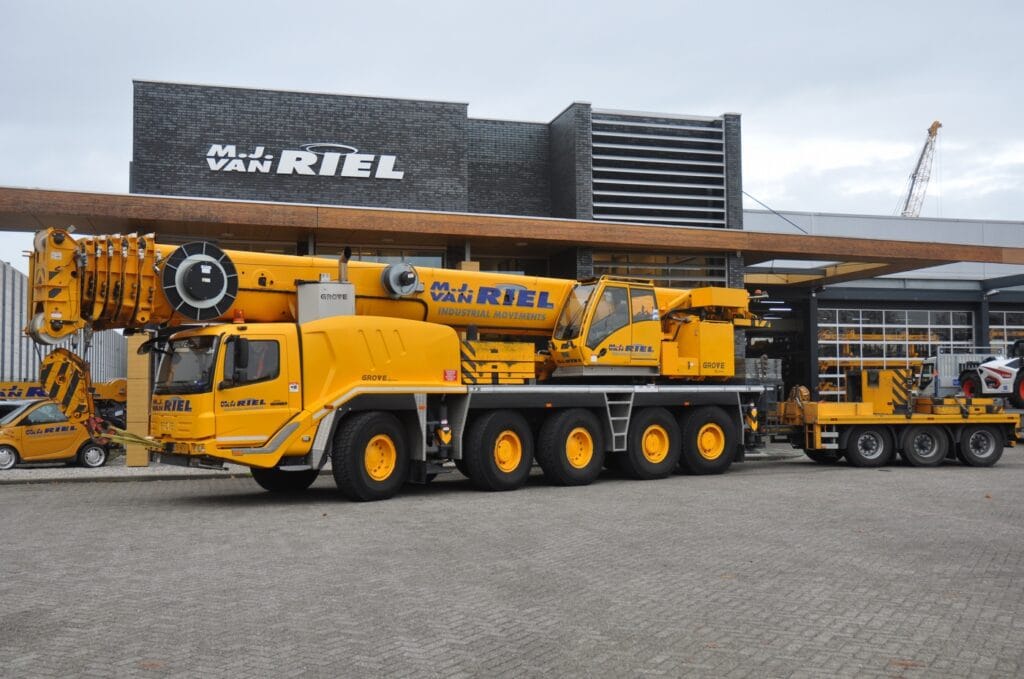 Deze mobiele telescoopkraan kan o.a. worden ingezet bij het hijsen van elementen in de bouw en industrie. De Grove GMK5110-1 is voorzien van een beweegbare jib van 16 meter.