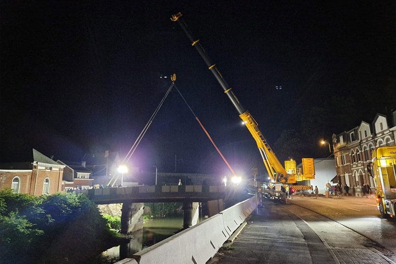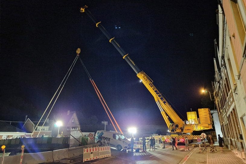 Als vervolg van de opdracht die we afgelopen maart hebben uitgevoerd, hebben wij afgelopen week wederom in Verviers een brugdeel geplaatst. Dit brugdeel hebben wij eerst vanuit de constructeur naar de spuiter gebracht, om deze vervolgens in de nacht naar de eindbestemming te transporteren. De daaropvolgende nacht hebben wij met onze 450-tons telescoopkraan het brugdeel van 37 ton op de fundatie geplaatst.