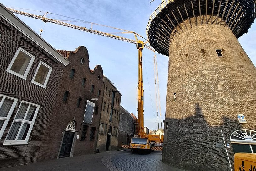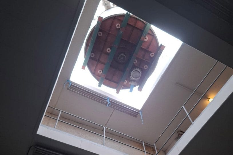 Na 30 jaar zijn de ketels weer onderweg om whisky te gaan maken. Via een dakluik van 3×3 meter hebben we met een 50 meter torenkraan de ketels, waarvan de grootste een doorsnede heeft van 2,90 meter, uit het pand gehesen.