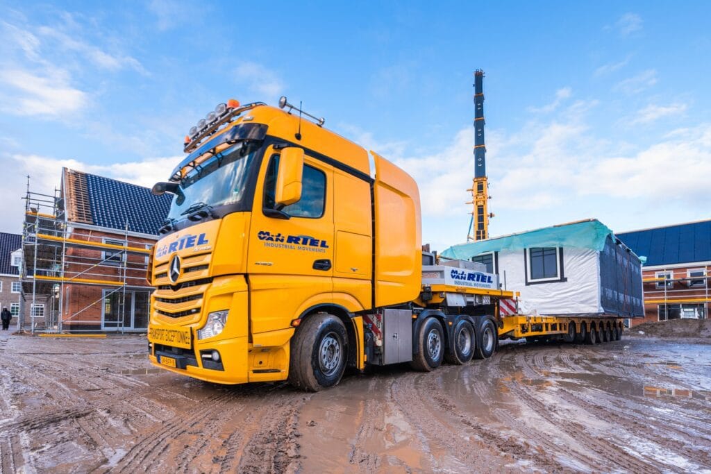 Hierbij werden de prefab woonelementen door middel van speciaal transport en transportbegeleiding aangevoerd; wegens de grote omvang van de elementen gebeurt dit ’s nachts. Bij het transport hebben we diverse van onze transporteenheden ingezet, zoals onze K25 aslijnen en onze Mercedes Actros zwaartransporttrekker.