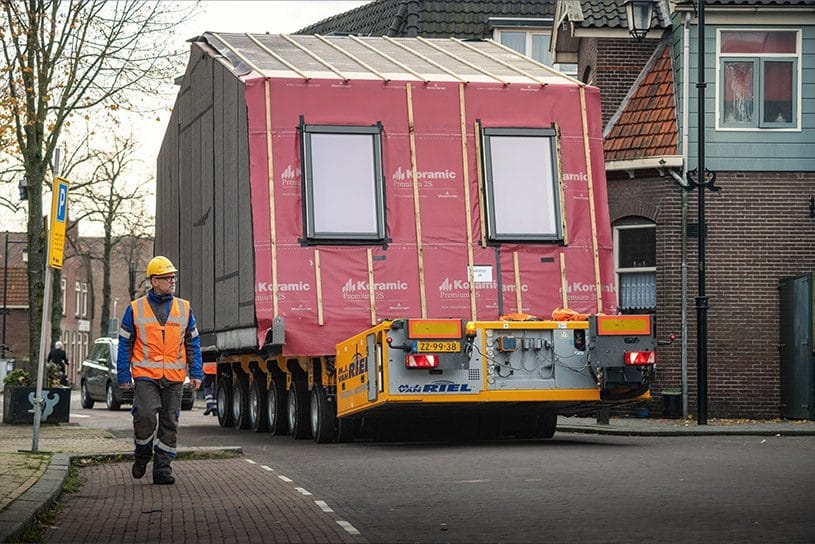 Eenmaal in Zaandam aangekomen hebben we de woonmodules, met een 450-tons telescoopkraan, op een zelf aangedreven platformtrailer geladen en door een woonwijk heen, naar de eindbestemming gebracht.